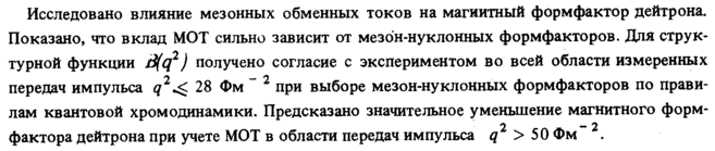Исследовано влияние мезонных обменных токов на магнитный формфактор дейтрона. Показано, что вклад МОТ сильно зависит от мезо'н-нуклонных формфакторов. Для структурной функции B(q2) получено согласие с экспериментом во всей области измеренных передач импульса q2^. 28 Фм " 2 при выборе мезон-нуклонных формфакторов по правилам квантовой хромодинамики. Предсказано значительное уменьшение магнитного форм2 — 2 фактора дейтрона при учете МОТ в области передач импульса q > 50 Фм