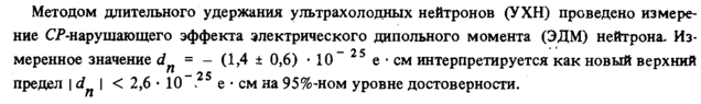 Методом длительного удержания ультрахолодных нейтронов (УХН) проведено измерение СЛнарушающего эффекта электрического дипольного момента (ЭДМ) нейтрона. Из-меренное значение с/ = — (1,4 ± 0,6) * 10 е · см интерпретируется как новый верхний 25 предел | d \ < 2,6 · 10 . е · см на 95%-ном уровне достоверности.