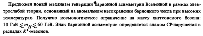 Предложен новый механизм генерации оарионной асимметрии Вселенной в рамках электрослабой теории, основанный на аномальном несохранении барионного числа при высоких температурах. Получено космологическое ограничение на массу хигтсовского бозона: 10 ГэВ £,mjj,^60 ГэВ. Знак барионной асимметрии определяется знаком CP-нарушения в распадах К* -мезонов.