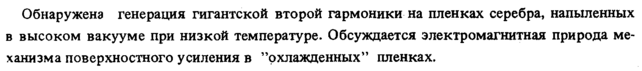 Обнаружена генерация гигантской второй гармоники на пленках серебра, напыленных в высоком вакууме при низкой температуре. Обсуждается электромагнитная природа механизма поверхностного усиления в "охлажденных" пленках.