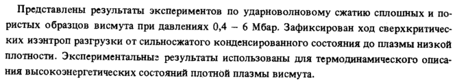 Представлены результаты экспериментов по ударноволновому сжатию сплошных и пористых образцов висмута при давлениях 0,4 6 Мбар. Зафиксирован ход сверхкритических изэнтроп разгрузки от сильносжатого конденсированного состояния до плазмы низкой плотности. Экспериментальные результаты использованы для термодинамического описания высокоэнергетических состояний плотной плазмы висмута.