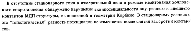 В отсутствие стационарного тока в измерительной цепи в режиме квантования холловс-кого сопротивления обнаружено нарушение эквипотенциальности внутреннего и внешнего контактов МДП-структуры, выполненной в геометрии Корбино. В стационарных условиях эта "топологическая" разность потенциалов не изменяется после снятия заксротки контак-' тов.