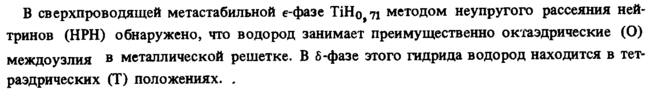В сверхпроводящей метастабильной е-фазе TiH0>7i методом неупругого рассеяния ней-тринов (НРН) обнаружено, что водород занимает преимущественно октаэдрические (О) междоузлия в металлической решетке. В δ-фазе этого гидрида водород находится в тет* раэдрических (Т) положениях. .