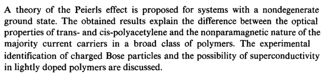 A theory of the Peierls effect is proposed for systems with a nondegenerate ground state. The obtained results explain the difference between the optical properties of transand cis-polyacetylene and the nonparamagnetic nature of the majority current carriers in a broad class of polymers. The experimental identification of charged Bose particles and the possibility of superconductivity in lightly doped polymers are discussed.