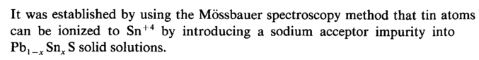 It was established by using the Mossbauer spectroscopy method that tin atoms can be ionized to Sn+4 by introducing a sodium acceptor impurity into Pbj_^ Sn^ S solid solutions.