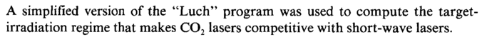 A simplified version of the "Luch" program was used to compute the target-irradiation regime that makes C02 lasers competitive with short-wave lasers.