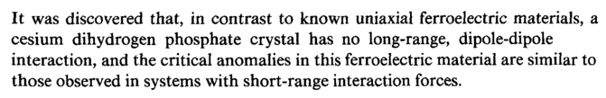 It was discovered that, in contrast to known uniaxial ferroelectric materials, a cesium dihydrogen phosphate crystal has no long-range, dipole-dipole interaction, and the critical anomalies in this ferroelectric material are similar to those observed in systems with short-range interaction forces.
