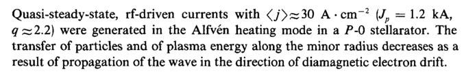 Quasi-steady-state, rf-driven currents with <j>~30 A · cm-2 (Jp = 1.2 kA, q —2.2) were generated in the Alfven heating mode in a P-0 stellarator. The transfer of particles and of plasma energy along the minor radius decreases as a result of propagation of the wave in the direction of diamagnetic electron drift.