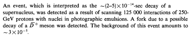 An event, which is interpreted as the ~(2-5)X 10~14-sec decay of a supernucleus, was detected as a result of scanning 125 000 interactions of 250-GeV protons with nuclei in photographic emulsions. A fork due to a possible decay of a D 0 meson was detected. The background of this event amounts to -3X10-5.