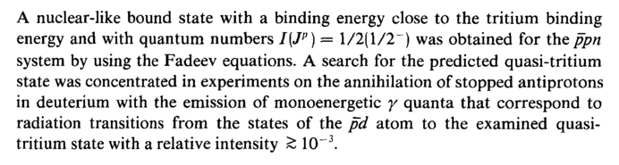 A nuclear-like bound state with a binding energy close to the tritium binding energy and with quantum numbers I{JP) = 1/2(1/2") was obtained for the ppn system by using the Fadeev equations. A search for the predicted quasi-tritium state was concentrated in experiments on the annihilation of stopped antiprotons in deuterium with the emission of monoenergetic γ quanta that correspond to radiation transitions from the states of the pd atom to the examined quasi-tritium state with a relative intensity £ 10~3.