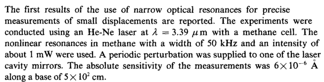 The first results of the use of narrow optical resonances for precise measurements of small displacements are reported. The experiments were conducted using an He-Ne laser at λ = 3,39 μτη with a methane cell. The nonlinear resonances in methane with a width of 50 kHz and an intensity of about 1 mW were used. A periodic perturbation was supplied to one of the laser cavity mirrors. The absolute sensitivity of the measurements was 6χ10~6 A along a base of 5 Χ 102 cm.