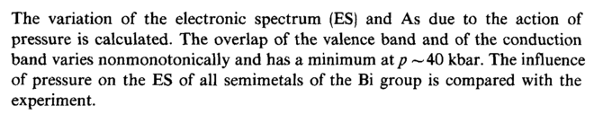 The variation of the electronic spectrum (ES) and As due to the action of pressure is calculated. The overlap of the valence band and of the conduction band varies nonmonotonically and has a minimum at ρ ~ 40 kbar. The influence of pressure on the ES of all semimetals of the Bi group is compared with the experiment.
