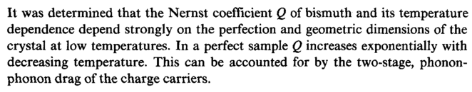 It was determined that the Nernst coefficient Q of bismuth and its temperature dependence depend strongly on the perfection and geometric dimensions of the crystal at low temperatures. In a perfect sample Q increases exponentially with decreasing temperature. This can be accounted for by the two-stage, phonon-phonon drag of the charge carriers.