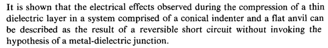 It is shown that the electrical effects observed during the compression of a thin dielectric layer in a system comprised of a conical indenter and a flat anvil can be described as the result of a reversible short circuit without invoking the hypothesis of a metal-dielectric junction.