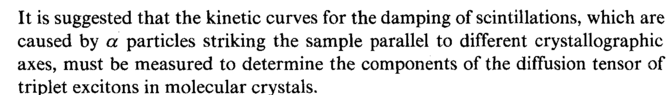 It is suggested that the kinetic curves for the damping of scintillations, which are caused by a particles striking the sample parallel to different crystallographic axes, must be measured to determine the components of the diffusion tensor of triolet excitons in molecular crvstals.