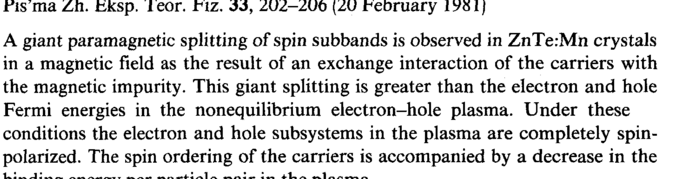 ns ma ζ,η. fcksp. leor. riz. jj, zuz-zuo (zu reoruary iy«i/ A giant paramagnetic splitting of spin subbands is observed in ZnTe:Mii crystals in a magnetic field as the result of an exchange interaction of the carriers with the magnetic impurity. This giant splitting is greater than the electron and hole Fermi energies in the nonequilibrium electron-hole plasma. Under these conditions the electron and hole subsystems in the plasma are completely spin-polarized. The spin ordering of the carriers is accompanied by a decrease in the kin/^inn anat-mi ÐÇÉ41Ì!Ì ηηιψž 1 ft ilia txlncmn