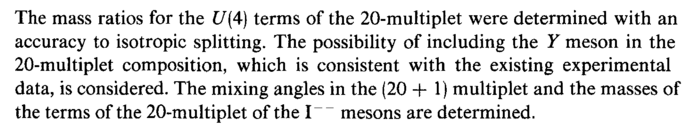 The mass ratios for the U(4) terms of the 20-multiplet were determined with an accuracy to isotropic splitting. The possibility of including the Y meson in the 20-multiplet composition, which is consistent with the existing experimental data, is considered. The mixing angles in the (20 + 1) multiplet and the masses of the terms of the 20-multiplet of the I~~ mesons are determined.