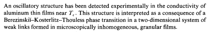 An oscillatory structure has been detected experimentally in the conductivity of aluminum thin films near Tc. This structure is interpreted as a consequence of a Berezinskii-Kosterlitz-Thouless phase transition in a two-dimensional system of weak links formed in microscopically inhomogeneous, granular films.