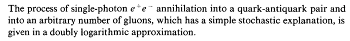 The process of single-photon e+e~ annihilation into a quark-antiquark pair and into an arbitrary number of gluons, which has a simple stochastic explanation, is given in a doubly logarithmic approximation.