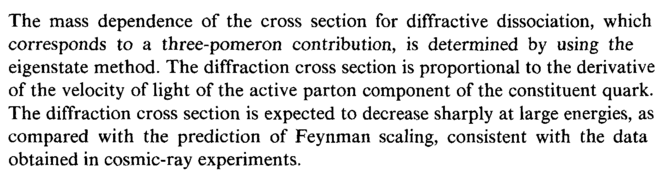 The mass dependence of the cross section for diffractive dissociation, which corresponds to a three-pomeron contribution, is determined by using the eigenstate method. The diffraction cross section is proportional to the derivative of the velocity of light of the active parton component of the constituent quark. The diffraction cross section is expected to decrease sharply at large energies, as compared with the prediction of Feynman scaling, consistent with the data obtained in cosmic-ray experiments.