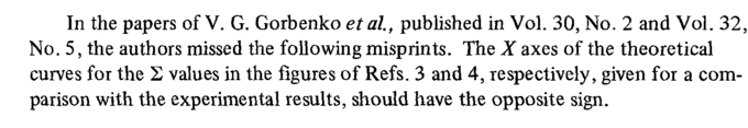 In the papers of V. G. Gorbenko etal, published in Vol. 30, No. 2 and Vol. 32, No. 5, the authors missed the following misprints. The X axes of the theoretical curves for the Σ values in the figures of Refs. 3 and 4, respectively, given for a comparison with the experimental results, should have the opposite sign.