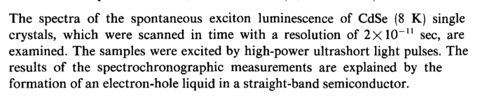 The spectra of the spontaneous exciton luminescence of CdSe (8 K) single crystals, which were scanned in time with a resolution of 2χ10~11 sec, are examined. The samples were excited by high-power ultrashort light pulses. The results of the spectrochronographic measurements are explained by the formation of an electron-hole liquid in a straight-band semiconductor.