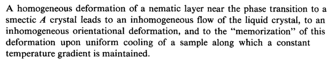 A homogeneous deformation of a nematic layer near the phase transition to a smectic A crystal leads to an inhomogeneous flow of the liquid crystal, to an inhomogeneous orientational deformation, and to the "memorization" of this deformation upon uniform cooling of a sample along which a constant temperature gradient is maintained.