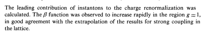 The leading contribution of instantons to the charge renormalization was calculated. The/? function was observed to increase rapidly in the region g~ 1, in good agreement with the extrapolation of the results for strong coupling in the lattice.