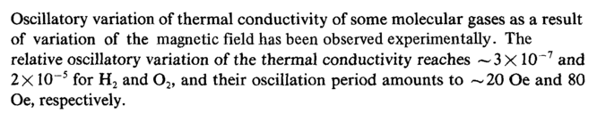 Oscillatory variation of thermal conductivity of some molecular gases as a result of variation of the magnetic field has been observed experimentally. The relative oscillatory variation of the thermal conductivity reaches — 3X 10~7 and 2χ 10~5 for H2 and 02, and their oscillation period amounts to ~20 Oe and 80 Oe, respectively.