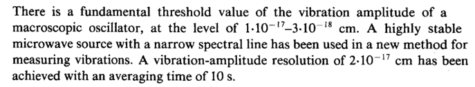 There is a fundamental threshold value of the vibration amplitude of a macroscopic oscillator, at the level of ЫО~!7-3*10_!8 cm. A highly stable microwave source with a narrow spectral line has been used in a new method for measuring vibrations. A vibration-amplitude resolution of 2-10"17 cm has been achieved with an averaging time of 10 s.