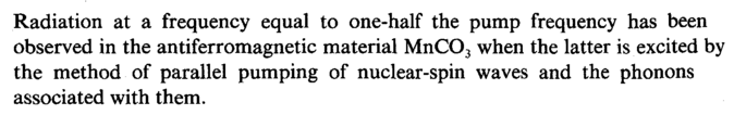 Radiation at a frequency equal to one-half the pump frequency has been observed in the antiferromagnetic material MnC03 when the latter is excited by the method of parallel pumping of nuclear-spin waves and the phonons associated with them.
