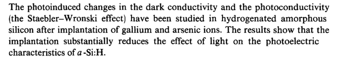 The photoinduced changes in the dark conductivity and the photoconductivity (the Staebler-Wronski effect) have been studied in hydrogenated amorphous silicon after implantation of gallium and arsenic ions. The results show that the implantation substantially reduces the effect of light on the photoelectric characteristics of a -Si:H.