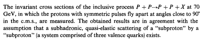 The invariant cross sections of the inclusive process Ρ + P-+P + Ρ + X at 70 GeV, in which the protons with symmetric pulses fly apart at angles close to 90° in the c.m.s., are measured. The obtained results are in agreement with the assumption that a subhadronic, quasi-elastic scattering of a "subproton" by a "subproton" (a system comprised of three valence quarks) exists.