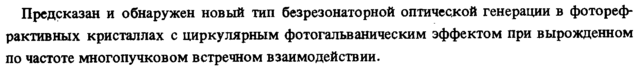 Предсказан и обнаружен новый тип безрезонаторной оптической генерации в фотореф-рактивных кристаллах с циркулярным фотогальваническим эффектом при вырожденном по частоте многопучковом встречном взаимодействии.