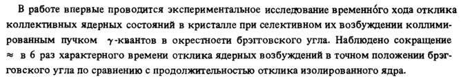 В работе впервые проводится экспериментальное исследование временного хода отклика коллективных ядерных состояний в кристалле при селективном их возбуждении коллими-рованным пучком γ-квантов в окрестности брэгтовского угла. Наблюдено сокращение » в 6 раз характерного времени отклика ядерных возбуждений в точном положении брэг-говского угла по сравнению с продолжительностью отклика изолированного ядра.