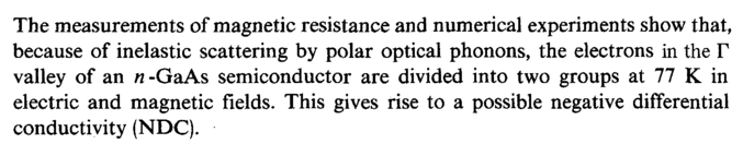 The measurements of magnetic resistance and numerical experiments show that, because of inelastic scattering by polar optical phonons, the electrons in the Γ valley of an л-GaAs semiconductor are divided into two groups at 77 К in electric and magnetic fields. This gives rise to a possible negative differential conductivity (NDC).