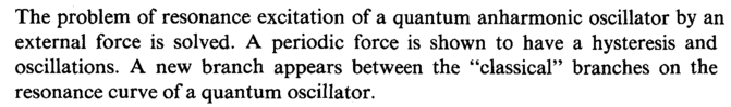 The problem of resonance excitation of a quantum anharmonic oscillator by an external force is solved. A periodic force is shown to have a hysteresis and oscillations. A new branch appears between the "classical" branches on the resonance curve of a quantum oscillator.