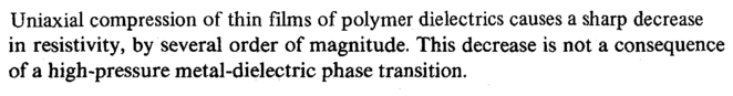 Uniaxial compression of thin films of polymer dielectrics causes a sharp decrease in resistivity, by several order of magnitude. This decrease is not a consequence of a high-pressure metal-dielectric phase transition.