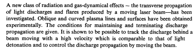 A new class of radiation and gas-dynamical effects — the transverse propagation of light discharges and flares produced by a moving laser beam—has been investigated. Oblique and curved plasma lines and surfaces have been obtained experimentally. The conditions for maintaining and terminating discharge propagation are given. It is shown to be possible to track the discharge behind a beam moving with a high velocity which is comparable to that of light detonation and to control the discharge propagation by moving the beam.