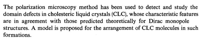 The polarization microscopy method has been used to detect and study the domain defects in cholesteric liquid crystals (CLC), whose characteristic features are in agreement with those predicted theoretically for Dirac monopole structures. A model is proposed for the arrangement of CLC molecules in such formations.