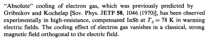 "Absolute'* cooling of electron gas, which was previously predicted by Gribnikov and Kochelap [Sov. Phys. JETP 58, 1046 (1970)], has been observed experimentally in high-resistance, compensated InSb at TQ = 78 К in warming electric fields. The cooling effect of electron gas vanishes in a classical, strong magnetic field orthogonal to the electric field.