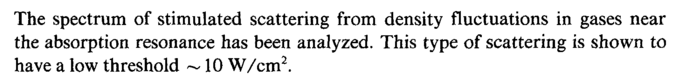 The spectrum of stimulated scattering from density fluctuations in gases near the absorption resonance has been analyzed. This type of scattering is shown to have a low threshold ~ 10 W/cm2.