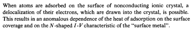 When atoms are adsorbed on the surface of nonconducting ionic crystal, a derealization of their electrons, which are drawn into the crystal, is possible. This results in an anomalous dependence of the heat of adsorption on the surface coverage and on the N-shaped I-V characteristic of the "surface metal".