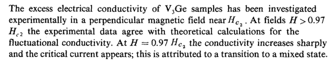Magnetic field dependence of the electrical conductivity in V3Ge in the vicinity of H2c