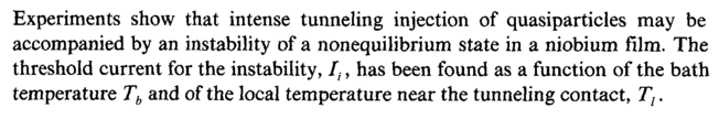 Experiments show that intense tunneling injection of quasiparticles may be accompanied by an instability of a nonequilibrium state in a niobium film. The threshold current for the instability, Ii, has been found as a function of the bath temperature Tb and of the local temperature near the tunneling contact, T{.
