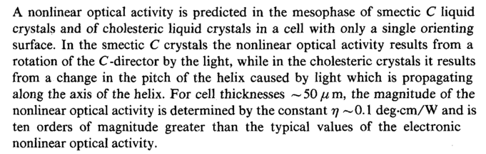 A nonlinear optical activity is predicted in the mesophase of smectic С liquid crystals and of cholesteric liquid crystals in a cell with only a single orienting surface. In the smectic С crystals the nonlinear optical activity results from a rotation of the С -director by the light, while in the cholesteric crystals it results from a change in the pitch of the helix caused by light which is propagating along the axis of the helix. For cell thicknesses ~ 50 μ m, the magnitude of the nonlinear optical activity is determined by the constant η ~0.1 deg-cm/W and is ten orders of magnitude greater than the typical values of the electronic nonlinear optical activity.