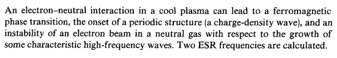 An electron-neutral interaction in a cool plasma can lead to a ferromagnetic phase transition, the onset of a periodic structure (a charge-density wave), and an instability of an electron beam in a neutral gas with respect to the growth of some characteristic high-frequency waves. Two ESR frequencies are calculated.
