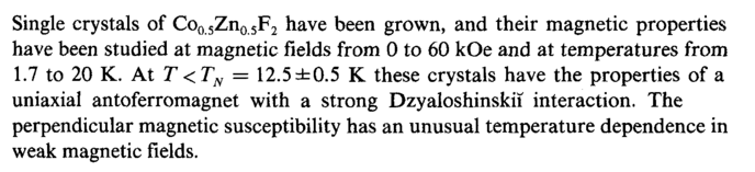 Single crystals of Co0 5Zn0 5F2 have been grown, and their magnetic properties have been studied at magnetic fields from 0 to 60 kOe and at temperatures from 1.7 to 20 K. At Τ <TN = 12.5 ±0.5 К these crystals have the properties of a uniaxial antoferromagnet with a strong Dzyaloshinskii interaction. The perpendicular magnetic susceptibility has an unusual temperature dependence in weak magnetic fields.