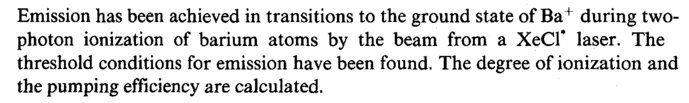 Emission has been achieved in transitions to the ground state of Ba+ during two-photon ionization of barium atoms by the beam from Á èÅóç laser. The threshold conditions for emission have been found. The degree of ionization and the pumping efficiency are calculated.
