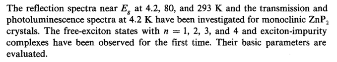 The reflection spectra near Ε at 4.2, 80, and 293 К and the transmission and photoluminescence spectra at 4.2 К have been investigated for monoclinic ZnP2 crystals. The free-exciton states with η — 1, 2, 3, and 4 and exciton-impurity complexes have been observed for the first time. Their basic parameters are evaluated.